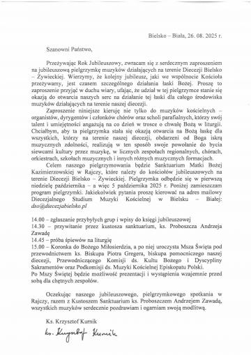 Zaproszenie na jubileuszową pielgrzymką muzyków działających na terenie Diecezji Bielsko-Żywieckiej